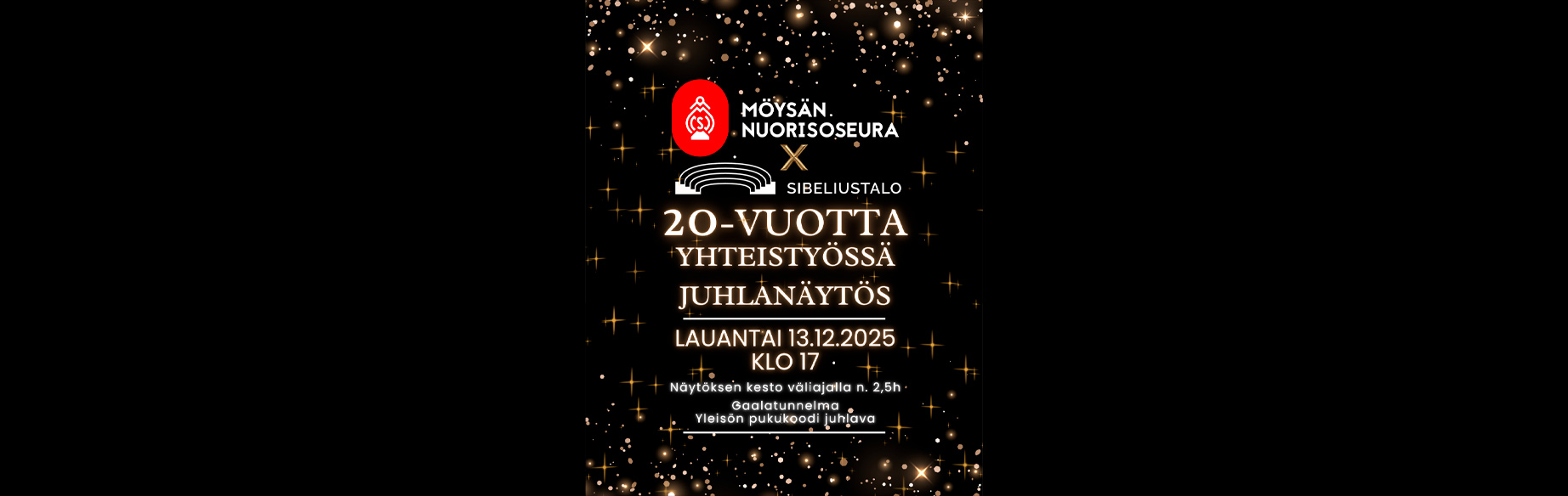 Möysän Nuorisoseuran juhlatanssinäytös lauantaina 13.12. klo 17 alkaen Sibeliustalolla! Näytöksessä juhlitaan 20-vuotista yhteistyötä Sibeliustalon kanssa.